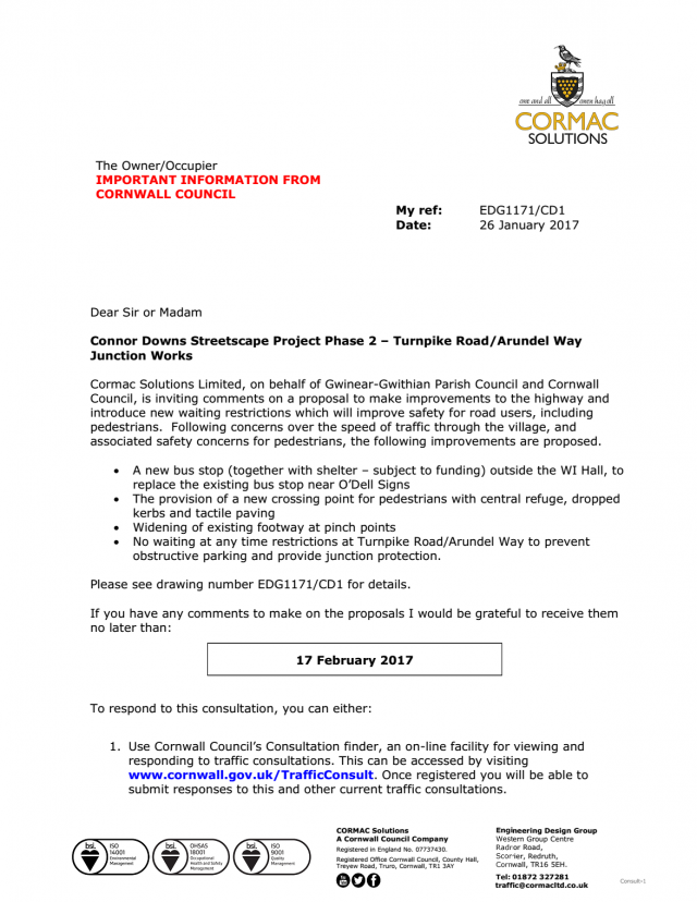 Scheme initiated by the Parish Council to address the concerns of the residents of Connor Downs regarding the safety of pedestrians in the vicinity of the works.
