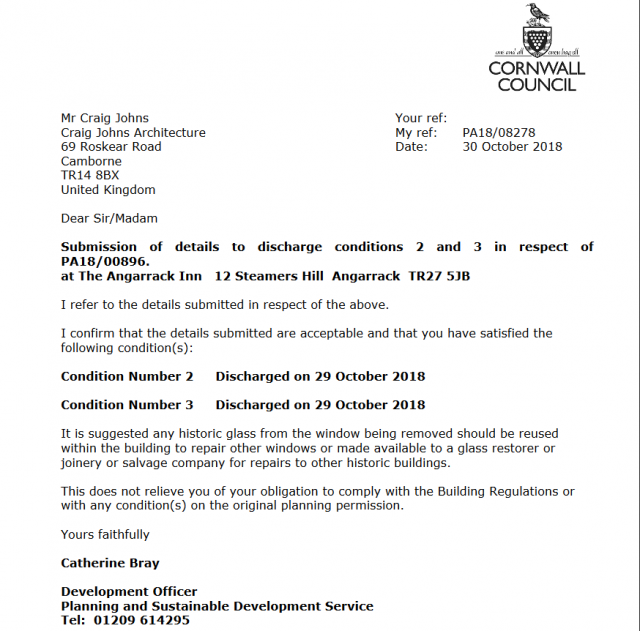 - 180905 | PA18/08278 | Submission of details to discharge conditions 2 and 3 in respect of PA18/00896. - The Angarrack Inn 12 Ste