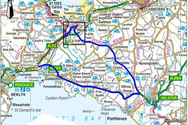 "Westbound - At St Erth roundabout take the exit for the B3301 towards Hayle. Remain on the B3301 until its junction with the B3302 in Hayle. At the roundabout, take the B3302 following signs for Helston. Remain on the B3302 eastbound passing through Leedstown and Trenwheal continuing to follow signs for Helston. At the B3302 T-junction with the A394, turn right and take the A394 westbound towards Penzance. Remain on the A394 to its junction with the A30, Newtown roundabout, and re-join the A30 westbound.