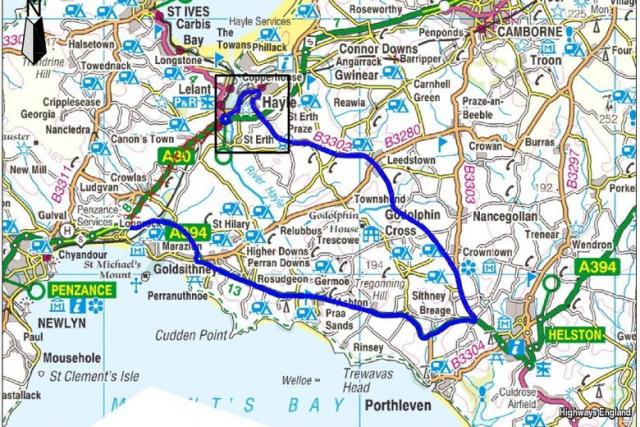 "Eastbound - Exit the A30 at Newtown and take the A394 towards Helston. Then take the B3302 westbound towards Hayle. At Hayle, take the B3301 to re-join the A30 at the St Erth roundabout".