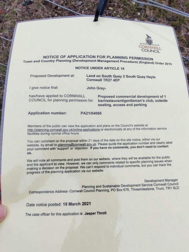It was discovered at South Quay and claims that "John Gray has/have applied to Cornwall Council for planning application for: Proposed commercial development of 1 bar/restaurant/gentlemen's club, outside seating, access and parking".