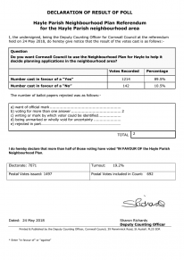 The referendum for the Hayle Neighbourhood Plan took place on 24 May 2018 and 89.4% of those who voted, voted YES.