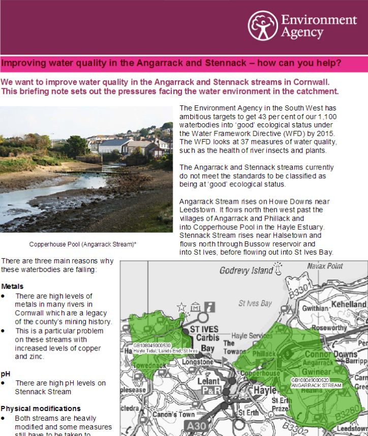 The Environment Agency in the South West has ambitious targets to get 43 per cent of our 1,100 waterbodies into ‘good’ ecological status under the Water Framework Directive (WFD) by 2015. The WFD looks at 37 measures of water quality, such as the health of river insects and plants. The Angarrack and Stennack streams currently do not meet the standards to be classified as being at ‘good’ ecological status.