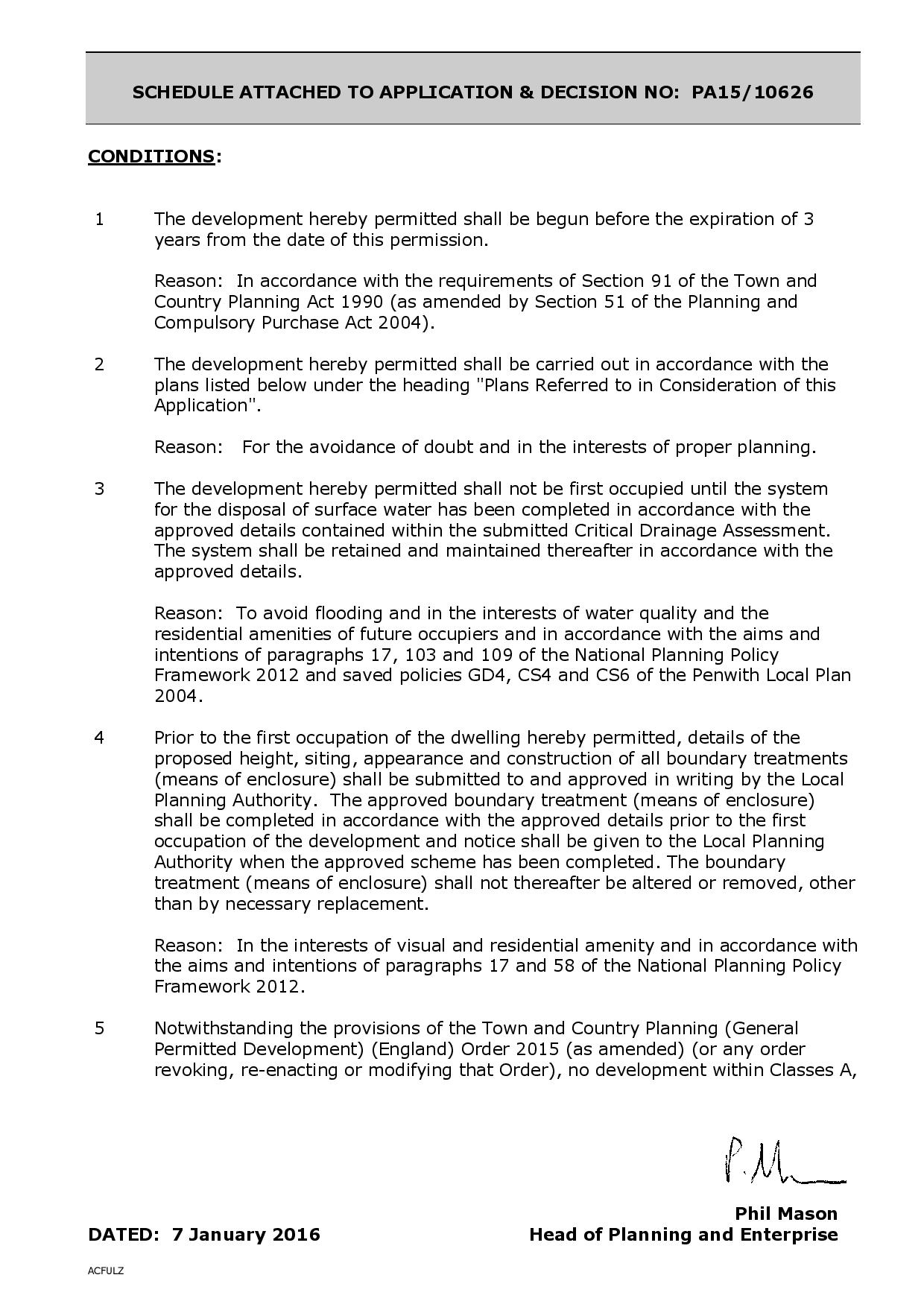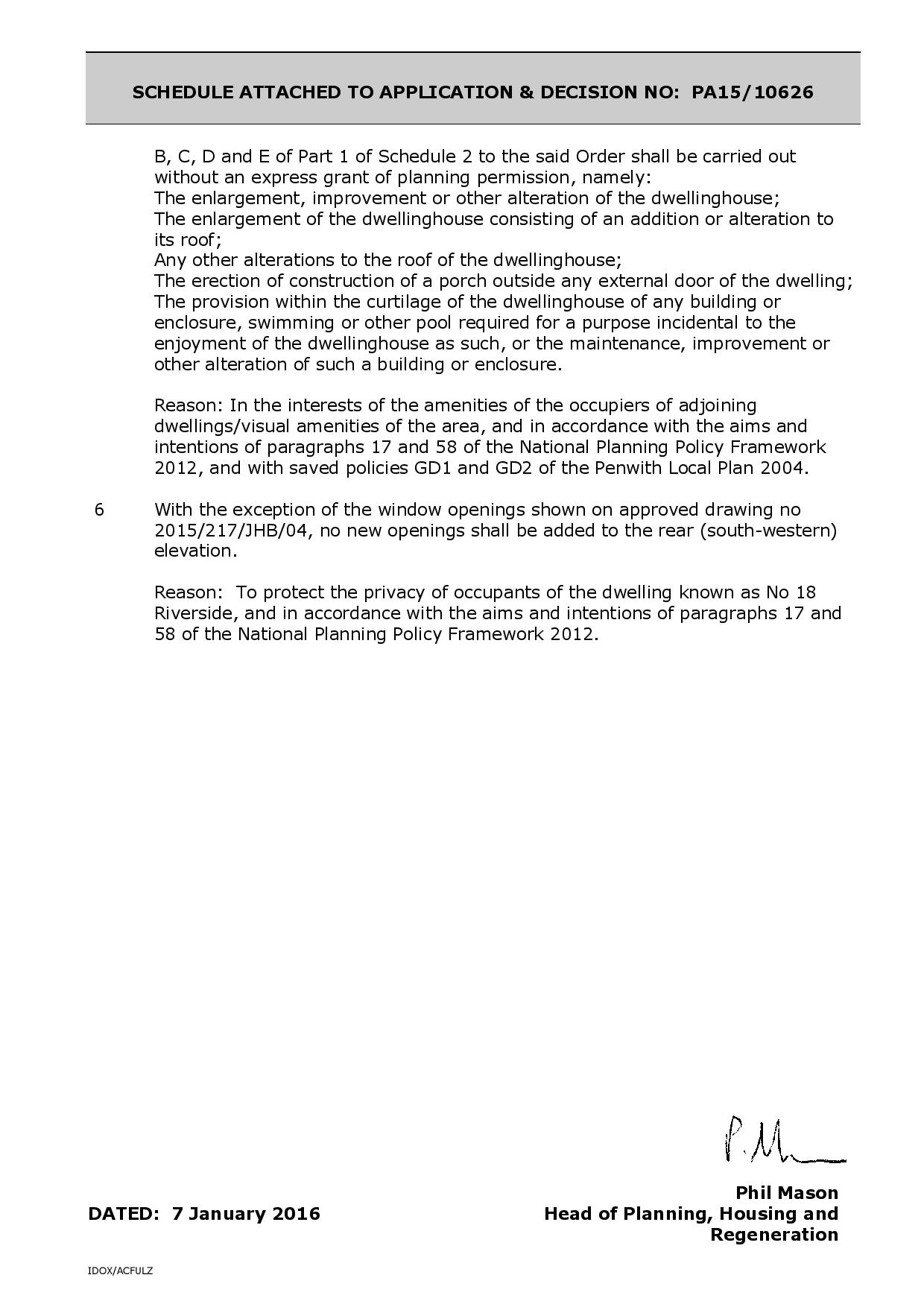 Reason: In the interests of visual and residential amenity and in accordance with the aims and intentions of paragraphs 17 and 58 of the National Planning Policy Framework 2012. 5 Notwithstanding the provisions of the Town and Country Planning (General Permitted Development) (England) Order 2015 (as amended) (or any order revoking, re-enacting or modifying that Order), no development within Classes A, DATED: 7 January 2016 ACFULZ Phil Mason Head of Planning and Enterprise