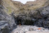 Oates continues: “Its entrance had doors of iron on it for security and was known locally as ‘Iron Doors’.” There is little evidence at the cave today that it once had iron doors, but it is believed that it also housed the digger or bulldozer which was used to dig up the sand from the beach at later dates.