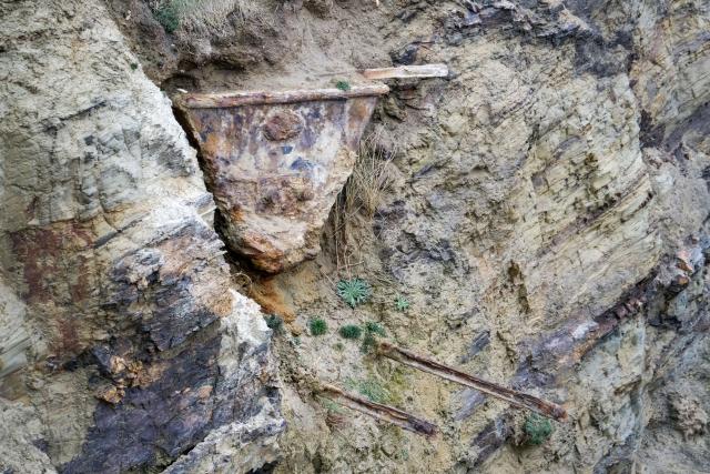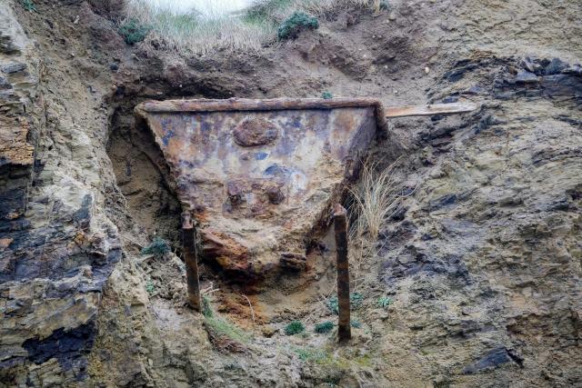 A 100-year-old cart is emerging from a cliff at Gwithian after vegetation was cleared from around it two years ago, and some more recent erosion, making it more visible. The cart is thought to be part of the Gwithian Tin Works, which lifted tin-rich sand from the beach below to a sifting site via an aerial ropeway. (Image: Greg Martin / Cornwall Live)