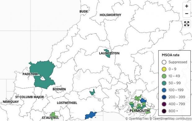 All the areas showing have seen rises on the previous week, bringing them back on the map: Crowan, Wendron & Stithians (up one), Camborne West (up five), Redruth North (up one), St Austell East & Carlyon Bay (up one), Looe & Polperro (up three), Liskeard (up one), Trebetherick & Whitecross (up one), Launceston (up seven).