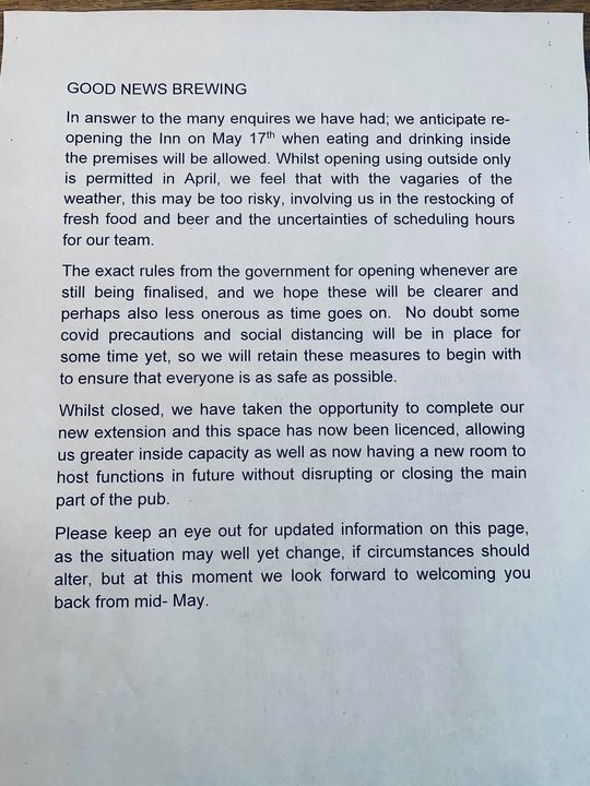 GOOD NEWS BREWING In answer to the many enquires we have had; we anticipate re- opening the Inn on May 17" when eating and drinking inside the premises will be allowed. Whilst opening using outside only is permitted in April, we feel that with the vagaries of the weather, this may be too risky, involving us in the restocking of fresh food and beer and the uncertainties of scheduling hours for our team. The exact rules from the government for opening whenever are still being finalised, and we hope these will be clearer and perhaps also less onerous as time goes on. No doubt some covid precautions and social distancing will be in place for some time yet, so we will retain these measures to begin with to ensure that everyone is as safe as possible. Whilst closed, we have taken the opportunity to complete our new extension and this space has now been licenced, allowing us greater inside capacity as well as now having a new room to host functions in future without disrupting or closing the main part of the pub. Please keep an eye out for updated information on this page. as the situation may well yet change, if circumstances should alter, but at this moment we look forward to welcoming you back from mid- May.