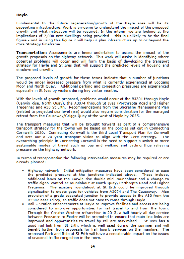 With the levels of growth proposed, problems would occur at the B3301 through Hayle