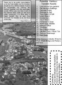 The two main issues that will go to consultation are: should the footbridge between Penpol Terrace and South Quay be half way along or at the Philp’s Pasty end?; and, the harbour and a fair bit of land will be gifted to Hayle – how should it be managed?