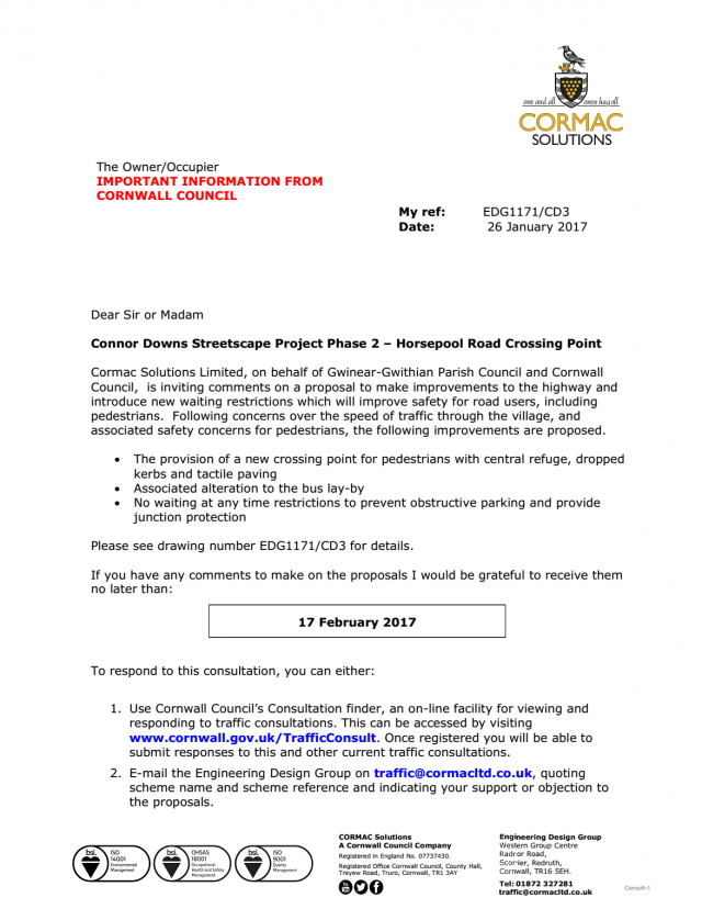 170126 | Consultation Connor Downs, Horsepool Road Pedestrian Crossing Works - Streetscape Projects Phase 2 (EDG1171/CD3) (Regio