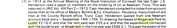 J.S. Henderson read a paper to members on the smelting of tin at Newham. Truro. This was reported in JRlC Vol. XIX Part 2 — 1913. Capt. Henderson compiled his notes from account books then at the office of Messrs. Bolitho & Co Chyandour. Penzance, many of which are now at the County Record office. Truro. Capt. Henderson quoted from one Newham account book entry — 'September 1 4th 1 704. To drawing the leases of Angarrack Paid by Lydall £2. 1 0.0' and that the rent