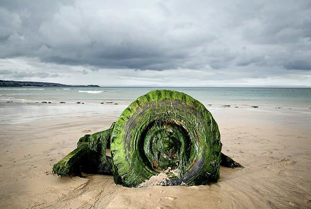 Upside- down and buried at the low water line on Gwithian beach below Mexico Towans and Beachside Holiday Park, the Land Rover has been stuck there since January 13, 1990.