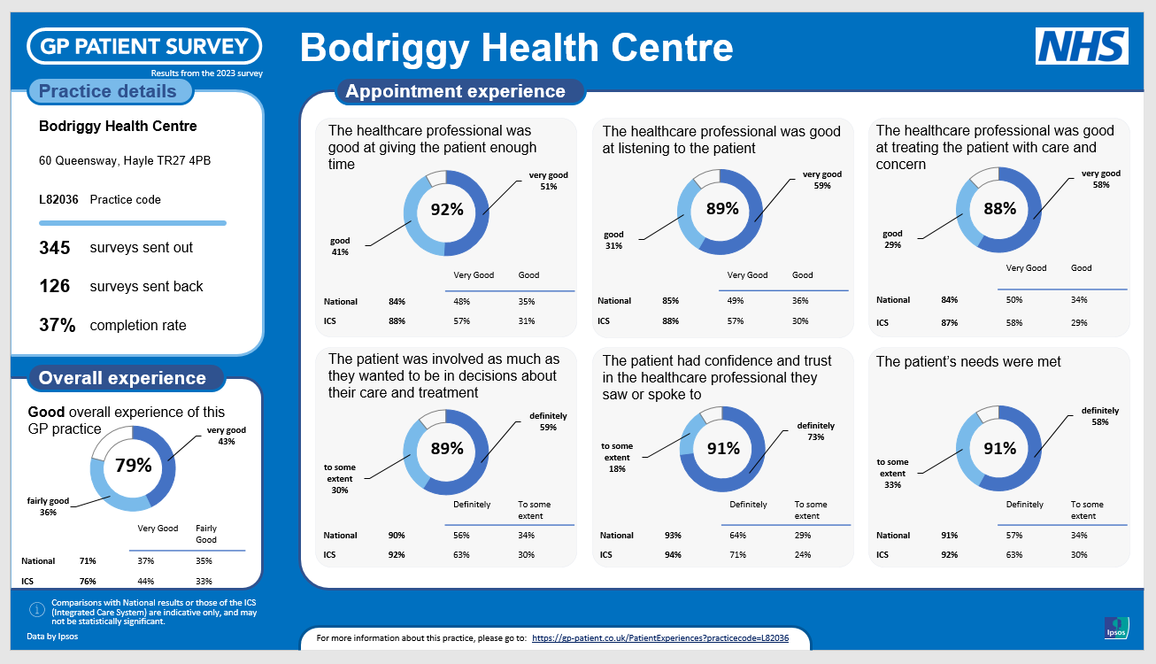 230730 | Practice Comparison: Praze-An-Beeble Surgery; Bodriggy Health Centre | 2023 GP Patient Survey