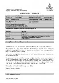 waste incineration, other incineration, landfill gas generation plant, Page 2 of 6 pyrolysis/gasification, anaerobic digestion, sewage treatment works, other incineration/ combustion. Waste: Landfill. Incl: inert landfill, non-hazardous landfill, hazardous landfill. Composting: Any composting proposal with more than 75000 tonnes maximum annual operational throughput. Incl: open windrow composting, in-vessel composting, anaerobic digestion, other waste management. Discharges: Any discharge of water or liquid waste that is more than 5m³/day. The water needs to either be discharged to ground (ie to seep away) or to surface water, such as a beck or stream. Discharges to mains sewer are excluded. Water Supply: Large infrastructure such as warehousing / industry where total net additional gross internal floorspace following development is 1,000m² or more. Wind Turbine Safeguarding Zone Classification: Any wind turbine 11metres to blade tip or taller, or has a rotor diameter of 2 metres or more. Consult: Ministry of Defence. Site: Cornwall Wind Turbine Safeguarding Zone Classification: All wind turbine development. Consult: NATS. Site: UK and Northern Ireland Relevant policies, SPGs and Government guidance: Cornwall Local Plan (Adopted 22 November 2016) (CLP)Policy Policy Policy Policy 1-Presumption in favour of sustainable development 12-Design 13-Development standards 26-Flood risk and management and coastal change National Planning Policy Framework (2012) (NPPF)Paragraph 32-Promoting sustainable transport Paragraphs 56, 57, 58, 60 and 61-Requiring good design Paragraph 69-Promoting healthy communities Paragraph 99-Meeting the challenge of climate change, flooding and coastal change Appraisal/key issues and conclusion: It was considered unnecessary to carry out a site visit in order to satisfactorily assess this application, due to the proposed development being small scale development and imagery allowed the site to be seen. Ownership certificate ok? Legal agreement? Is design in keeping? Any significant overlooking issues? Any significant loss of light issues? Any impact on protected trees? Any relevant history? Y N N N N Y N Page 3 of 6 If in a conservation area, will the development preserve or enhance? Conservation Area If a listed building, will the development preserve or enhance? Building Any harm impact on public right of way or setting? Public representations? If yes, see Public Access (web) Any identified significant adverse effects on protected species? N Not Not in a a Listed N N Principle of development: The principle of development is acceptable, dependent upon the impact on host dwelling, neighbouring properties and impact on the local area.