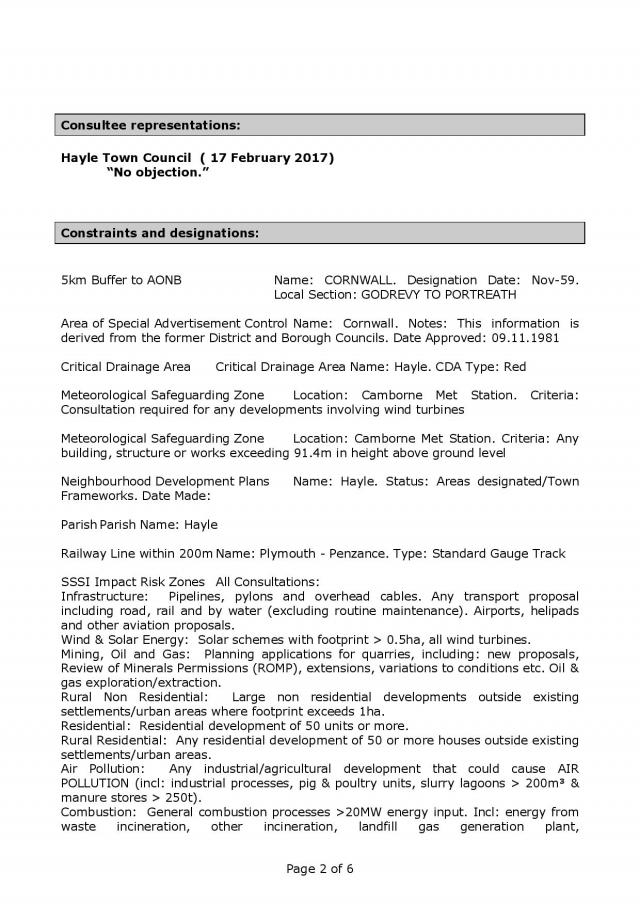 Demolition of existing garage, retaining access and the resiting and reconstruction of garage Full application Description of site and development: This application is for various works to a property known as 5 Riverside, Angarrack. The property is a two storey detached dwellinghouse, located in the centre of Angarrack. The property has amenity space on all elevations and an existing detached garage to the south east of the site. With regard to neighbouring properties, the area is characterised with detached two storey dwellinghouses. The proposal is to demolish the existing garage, retain the access and resite and reconstruct the garage. The proposed garage will be located 12m to the south eastern tip of the site. The proposed garage will be two storeys, with three rooflights. The entrance to the garage will be on the weste elevation with a single door and double roller doors. The garage will be rendered and tiled to match the existing. The site lies within a Critical Drainage Area (CDA). Relevant planning history- Public representations: None received to date. Consultee representations: Hayle Town Council ( 17 February 2017) “No objection.” Constraints and designations: 5km Buffer to AONB Name: CORNWALL. Designation Date: Nov-59. Local Section: GODREVY TO PORTREATH Area of Special Advertisement Control Name: Cornwall. Notes: This information is derived from the former District and Borough Councils. Date Approved: 09.11.1981 Critical Drainage Area Critical Drainage Area Name: Hayle. CDA Type: Red Meteorological Safeguarding Zone Location: Camborne Met Station. Consultation required for any developments involving wind turbines Criteria: Meteorological Safeguarding Zone Location: Camborne Met Station. Criteria: Any building, structure or works exceeding 91.4m in height above ground level Neighbourhood Development Plans Frameworks. Date Made: Name: Hayle. Status: Areas designated/Town Parish Parish Name: Hayle Railway Line within 200m Name: Plymouth - Penzance. Type: Standard Gauge Track SSSI Impact Risk Zones All Consultations: Infrastructure: Pipelines, pylons and overhead cables. Any transport proposal including road, rail and by water (excluding routine maintenance). Airports, helipads and other aviation proposals. Wind & Solar Energy: Solar schemes with footprint > 0.5ha, all wind turbines. Mining, Oil and Gas: Planning applications for quarries, including: new proposals, Review of Minerals Permissions (ROMP), extensions, variations to conditions etc. Oil & gas exploration/extraction. Rural Non Residential: Large non residential developments outside existing settlements/urban areas where footprint exceeds 1ha. Residential: Residential development of 50 units or more. Rural Residential: Any residential development of 50 or more houses outside existing settlements/urban areas. Air Pollution: Any industrial/agricultural development that could cause AIR POLLUTION (incl: industrial processes, pig & poultry units, slurry lagoons > 200m³ & manure stores > 250t). Combustion: General combustion processes >20MW energy input. Incl: energy from