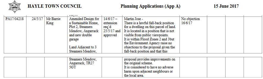 | PA17/04218 | 24/5/17 | Mr Barrie King | Amended Design for a Sustainable Home, Plot 2, Steamers Meadow, Angarrack and new double garage Land Adjacent to 3 Steamers Meadow, | 14/6/17 – extension req’d 25/5/17 and approved | Martin Jose - There is a lawful fall - back position for a dwelling on this parcel of land. It is located in a position that is not visible from public viewpoints. It is within Flood Zones 2 and 3 but the Environment Agency raise no objections to the proposal given the fall - back position and that this proposal provides improvements on the original scheme. It is considered to have no adverse harm upon adjacent neighbours or the local area. | No objection 16/6/17 | |||