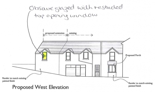 Amended design 5 June - West Elevation - obscure glass with restricted top opening window.