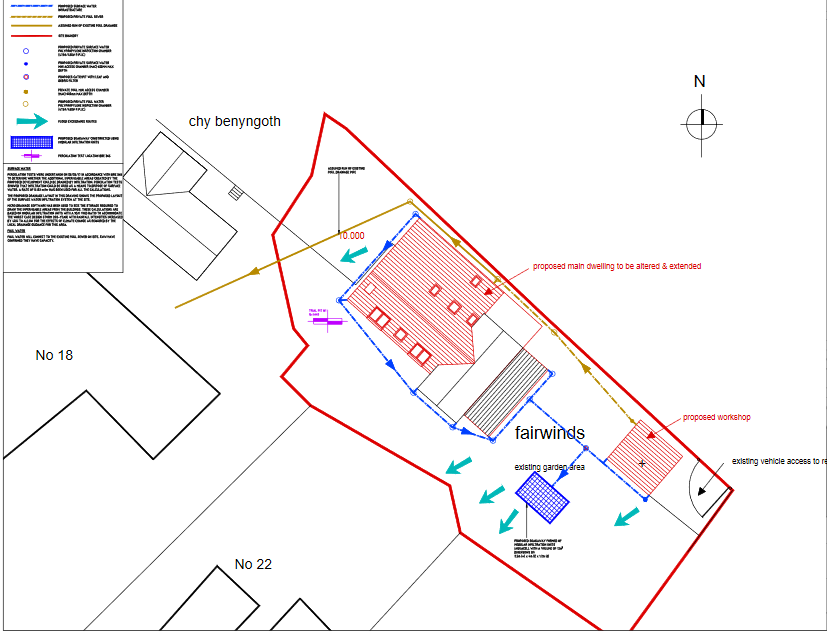 The site is located in a Floodzone, as in, flooding to the lower Angarrack Area, this was addressed by a Planning Condition under the Householder Application PA20/00542 and subsequently discharged after it was designed out utilising an onsite soakaway, under the Application PA21/00627, the soakway system was designed by Engineering and Development Solution to allievate any surface water run off or flooding lower down in Angarrack
