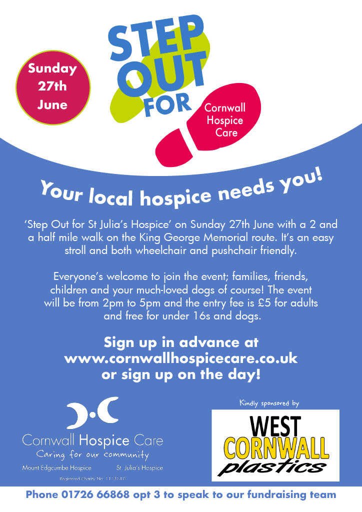 Cornwall Hospice Care has fought hard to keep going during the Covid-19 pandemic. Our clinical teams kept our hospices open, but our shops were closed for 7 of the last 12 months and our fundraising activities ground to a halt. This had a devastating effect on our ability to raise the funds needed to provide our care. As a result we are now asking you to Step Out for St Julia’s Hospice and help bring in the money we need to keep our hospice beds open.