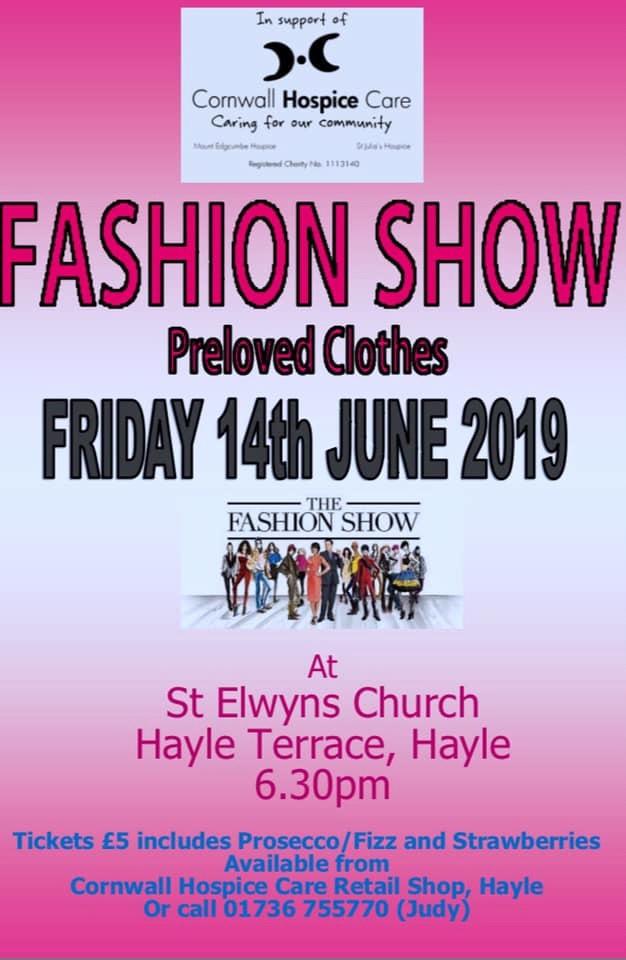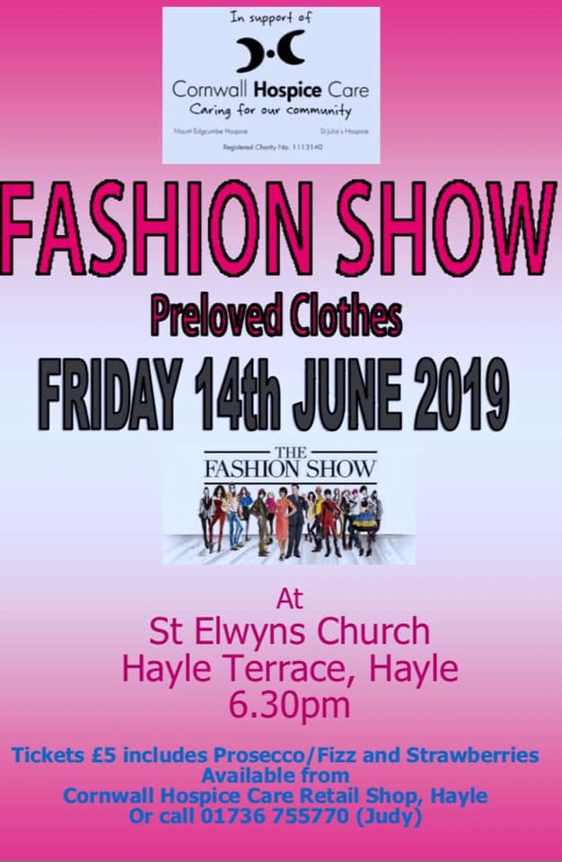 Fashion Show of preloved clothes. Your £5 entry includes a glass of fizz and strawberries. Tickets available to purchase at CHC Retail Shop in Hayle (cash only) or from Judy Lawton on 01736 755770.