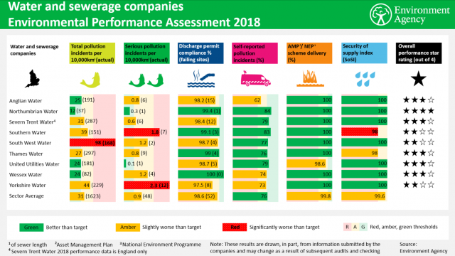 - Again this year South West Water is poor performing and has consistently demonstrated unacceptable performance and a red rating for pollution incidents. Most water companies look set to fail to meet 2020 pollution targets.