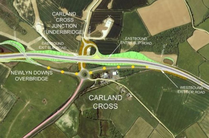- a two-level junction at Carland Cross with a new roundabout north of the dual carriageway and re-using the existing roundabout to the south