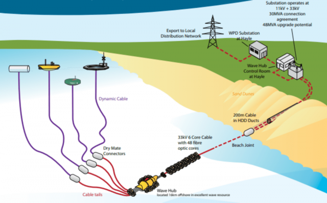 The current Wave Hub is a grid connected site located off the coast of Hayle. It was originally conceived for the testing and development of wave energy devices and arrays. It was funded through European Structural Funds and central government funding and became operational in 2010.