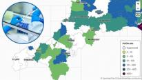 The map shows positive cases by 'Middle Super Output Area' - the name the government gives to the break-up of larger towns and groups of neighbouring towns and villages, with groupings covering a greater area than others.