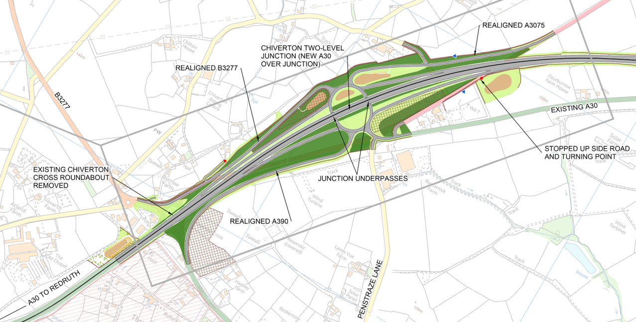 - At the western end of the scheme, the new dual carriageway would connect to the existing dual carriageway west of the existing Chiverton Cross junction.